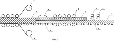 Изобретение поясняется чертежами, где на фиг.1 и фиг.2 представлена технологическая схема изготовления сэндвич-панелей с комбинированным утеплителем, причем на фиг.1 показан вид сбоку, а на фиг.2 – вид сверху на автоматическую линию. На схеме номерами позиций показаны: ковер из минераловатного утеплителя 1, система подготовки и подачи клея 2, система подготовки и подачи воды 3, листы пенополистерола 4, узел прессования 5, узел фрезерования комбинированного утеплителя 6, рольганг 7, рулон с оцинкованной сталью 8, поперечная минераловатная ламель 9.