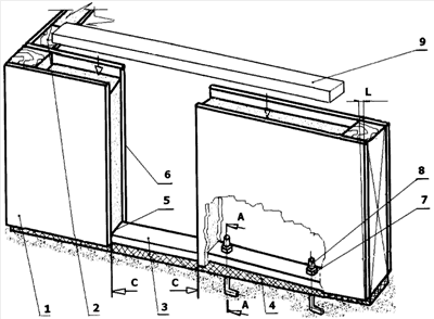 Монтаж стеновых панелей ведут начиная с угла конструкции, первую угловую панель 1 соединяют под прямым углом со второй панелью 2. Дальнейший монтаж конструкции ведут последовательно, соединяя панели между собой. Стеновые панели устанавливают, так чтобы нижний паз панели надевался на брус 3 обвязочного контура, установленный на ленточный эластичный элемент 4. С учетом наличия эластичной прокладки между брусом и фундаментом панель свободно устанавливается на брусе с зазором с фундаментом. Отклонение L монтируемой панели от вертикального положения проверяют с помощью отвеса. Эти отклонения связаны с погрешностью формирования паза в многослойной панели при ее сборке и выражаются в неперпендикулярности горизонтальных стенок пазов 5 и вертикальных торцов облицовки 6. Торец панели по вертикали выравнивают в процессе монтажа панели путем регулирования затяжки гаек 7 анкерных болтов 8, крепящих брус под данной панелью. Выравнивание происходит вследствие того, что брус имеет возможность прогибаться за счет находящегося под ним эластичного элемента 4. При этом та или иная затяжка одного бруса не влияет на возможность регулирования таким же образом бруса, следующего за данным, поскольку каждая регулируемая область под той или иной панелью является автономной, благодаря разрезам эластичного элемента (линии разреза обозначены стрелками С) на участки, равные длине каждой панели. Панели между собой скрепляют верхним обвязочным брусом 9.