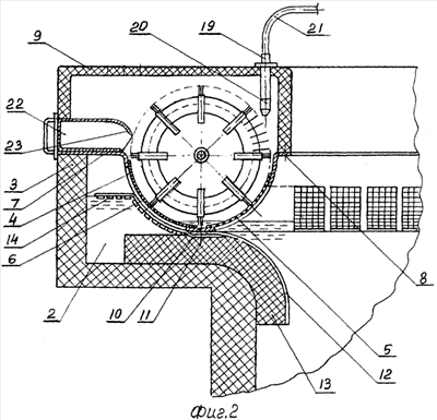 Бассейн содержит резервуар 1, переливной желоб 2 с его задней стенкой 3, поддерживающую решетку 4 с фильтровальной сеткой 5 грубой очистки воды и фильтровальной сеткой 6 тонкой очистки воды. Поддерживающая решетка 4 имеет две горизонтально расположенные полки: полку 7, опирающуюся на заднюю стенку 3 переливного желоба 2 и закрепленную на ней, и полку 8, на которую опирается крышка 9 переливного желоба 2. Поддерживающая решетка 4 имеет перемычку 10, к которой закреплена горизонтальная полка 11 расположенной под ней планки, изогнутая же по радиусу вниз полка 12 которой прижимает фильтрующий материал 13 к стенке резервуара 1 бассейна. Внутренняя кромка переливного коврика 14 прижата горизонтальной полкой 11 планки к фильтрующему материалу 13. Над поддерживающей решеткой 4 расположена ось 15 с установленными на ней крыльчатками 16 и колесом 17 водяной турбинки, закрепленная с помощью опор 18 к полкам 7 и 8 поддерживающей решетки 4. На крышке 9 переливного желоба 2, над лопатками колеса 17 водяной турбинки, установлен штуцер 19 с насадкой 20, соединенный с отводящим шлангом 21 водяного пылесоса. На полке 7 поддерживающей решетки 4 установлены лотки 22 с изогнутыми по радиусу козырьками-отсекателями 23.