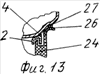 Чтобы скрыть направляющие 2 (фиг.12) и уплотнители в них, экран 24 выполняют с удлинителем 25, прикрывающим направляющие 2. Чтобы лед, снег, грязь при движении экрана вниз не попадали за экран, на экране выполняется отбортовка 26 (фиг.13), а чтобы во время дождя с корпуса двери 4 вода не попадала в паз экрана на корпусе 4 крепится уплотнитель 27.