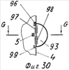Если полые цилиндр, конус, эллипсоид или любые другие фигуры вращения разрезать по оси их вращения (пополам или вырезать часть этих фигур), то экран, выполненный в виде этих фигур и вращающийся вокруг оси их вращения, будет иметь направляющие или уплотнители в форме сечения этих фигур. Например, экран 93 (фиг.30, 31) в виде полуцилиндра с торцевыми поверхностями вращается на осях 94 в опорах 95, соединенных с корпусом 4. Ось 94 соединена с приводом 13 (электродвигатель) посредством гибкого троса или карданного вала. Экран 93 имеет, например, верхний уплотнитель 96 и верхний торцевой уплотнитель 97, нижний торцевой сквозной уплотнитель 98 и нижний сквозной уплотнитель 99. Аналогично фигуре 31 на фигуре 32 показан экран 100 в виде эллипсоида вращения, а на фиг.33 – экран 101 произвольной фигуры вращения с направляющими и уплотнителями по контуру сечения этих фигур.