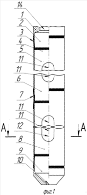 – при необходимости устранения помех при прохождении секций 5, 8 перекрывателя в перекрываемую зону, спуск проводится с промывкой ствола скважины через внутренние каналы 14 перекрывателя;