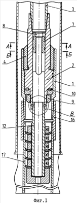 Несущая труба 2 снабжена окнами 6 для промывки. Внутри несущей трубы 2 расположена втулка 7, снабженная гнездом под бросовый шар-бомбу 8, а снаружи на конце установлена упорная втулка 9 для фиксации опорного подшипника 10. Втулка 7 зафиксирована в несущей трубе 2 посредством штифтов 11, установленных в сквозных отверстиях, выполненных в несущей трубе 2 (сквозные отверстия на чертеже условно не показаны).