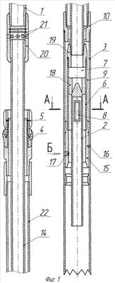 Полый концевик 14 оснащен клапаном 19, взаимодействующим с седлом 10 полого корпуса 3 при расположении штифта 16 полого наконечника 15 в верхней части длинной осевой проточки 12 – транспортное положение. Сверху полый концевик 14 соединен подвижно с втулкой 20, жестко соединенной с колонной труб 1 и оснащенной радиальными каналами 21, выполненными с возможностью перекрытия полым концевиком 15 при его перемещении вверх.
