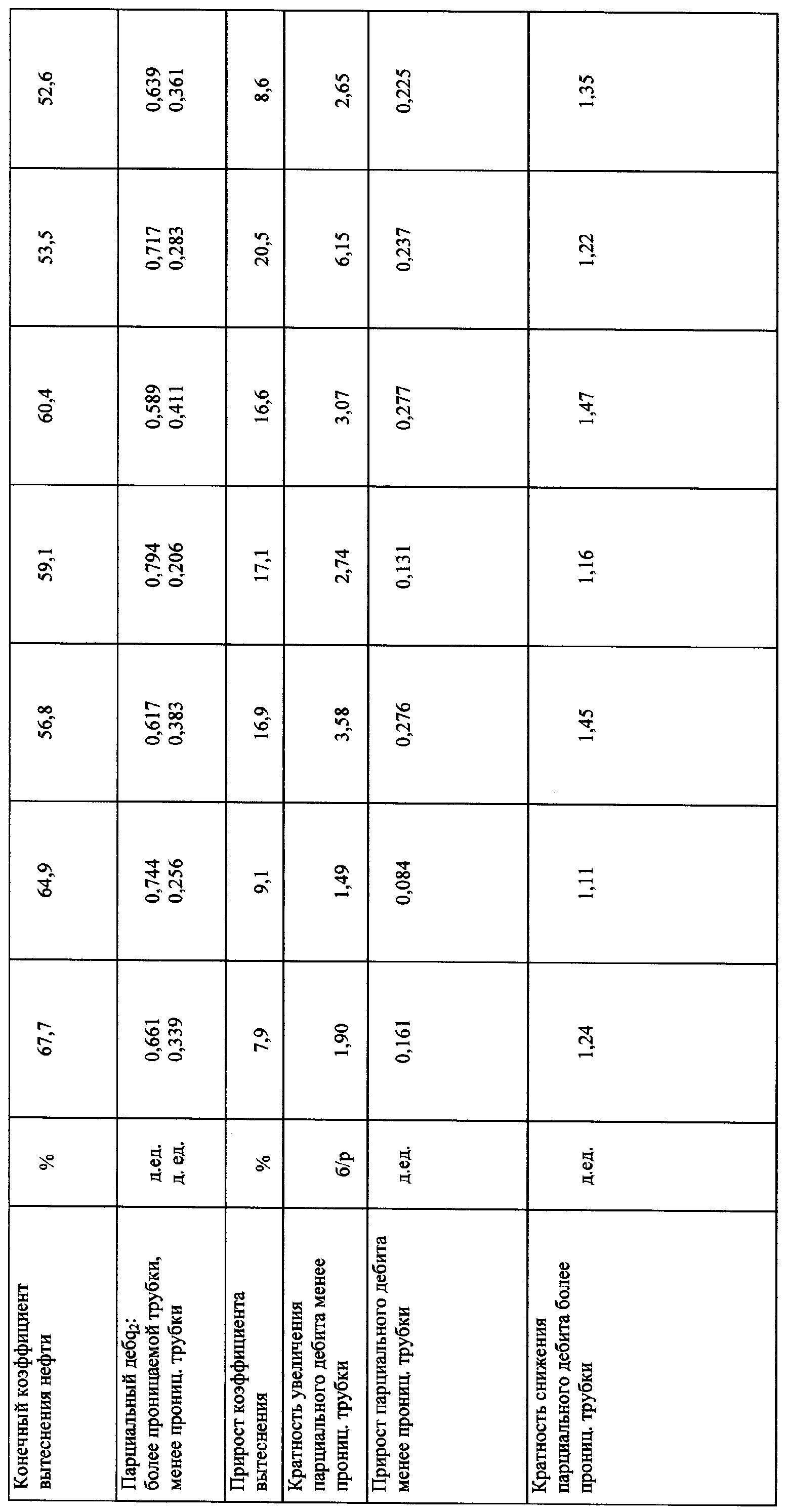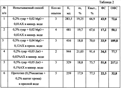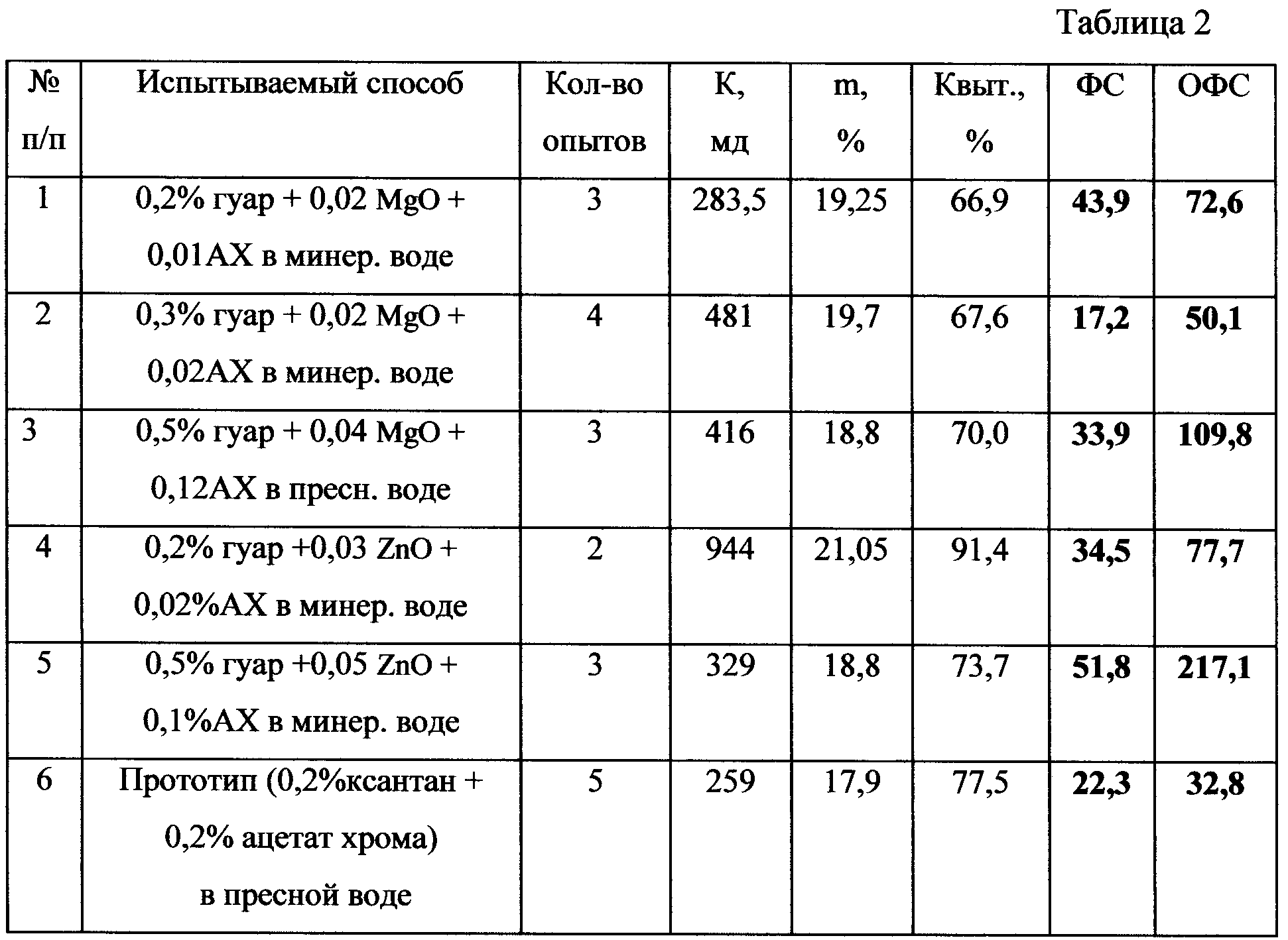 причем после закачки заданного объема гелеобразующего состава осуществляют технологическую выдержку продолжительностью от 3 до 5 суток. По химическому строению гуаровая камедь (гуар) представляет собой неионогенный полисахарид растительного происхождения. Молекулярная структура представляет собой прямую цепь, образованную галактозой и маннозой, следовательно, гуаровая камедь является галактоманнаном. Соотношение маннозы и галактозы должно быть приблизительно 2:1. Гуаровая камедь является гидроколлоидом с высоким молекулярным весом. При растворении в холодной и горячей воде гуар образует высоковязкий гель. С 1960 года начали применять гуар, сшитый боратными сшивателями для транспорта проппанта в жидкостях гидроразрыва для стимуляции притока в нефтяных и газовых скважинах методом гидроразрыва пласта (ГРП). Как раньше, так и сейчас в качестве сшивателя используют водорастворимые соединения бора (борная кислота или другие боросодержащие соединения) и гидроокись натрия как щелочной активатор для поддержания рН на уровне 10-10,5. Но сшитые полимерные составы на основе гуара и боратов практически не имеют индукционного периода сшивки, т.е. загущение композиции происходит практически сразу после смешения компонентов. Это создает трудности при осуществлении технологического процесса закачки таких сшитых полимерных составов на промыслах. С целью повышения нефтеотдачи неоднородных по проницаемости заводненных нефтяных пластов путем выравнивания проницаемостной неоднородности пласта закачкой гелеобразующего состава были разработаны сшитые полимерные составы с использованием в качестве сшивателей окислов двухвалентных металлов и ацетата хрома. Применение окислов металлов в качестве сшивателей до сих пор не практиковалось. Под влиянием сшивателей происходит структурирование водного раствора гуара с образованием гелеобразной системы. Процесс этот происходит во времени. В течение некоторого периода времени, называемого индукционным периодом, вязкость композиции практически не отличается от вязкости раствора полимера. За это время необходимо закачать ее в пласт, где и происходит образование сшитой полимерной системы (СПС). Длительный индукционный период позволяет продвинуть гелеобразующий состав на большую глубину до начала гелеобразования. Очевидно, что в более проницаемые пропластки состав внедрится на большую глубину, чем в малопроницаемые. Для образования прочной сшитой полимерной системы при закачке гелеобразующего состава в пласт по предлагаемым способам делают технологическую выдержку продолжительностью от 3 до 5 суток. Чем выше неоднородность, тем больше продолжительность технологической выдержки. Растворы гуаровой камеди имеют высокий коэффициент солестойкости. Коэффициент солестойкости – это устойчивость водных растворов полимеров к высаливающему действию электролитов, содержащихся в минерализованной (сточной) воде. Для приготовления растворов гуаровой камеди использовалась как пресная, так и минерализованная вода с общей минерализацией до 300 г/л, что значительно расширяет технологические возможности использования способа. В качестве сшивателей были использованы окислы цинка (ZnO) в минерализованной воде и окислы магния (MgO) в пресной и минерализованной воде в присутствии ацетата хр