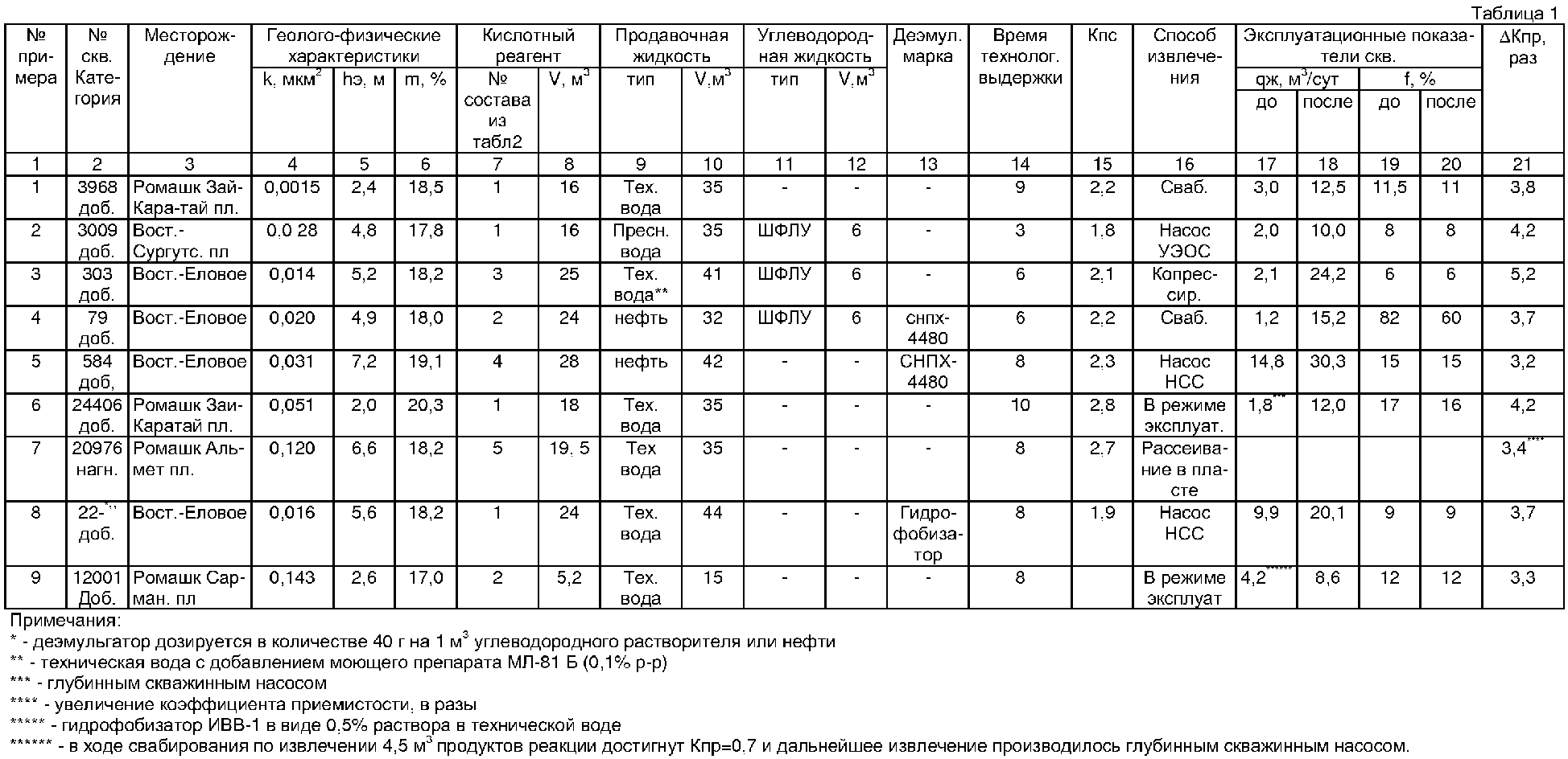 а в качестве продавочной жидкости берут пресную воду или техническую воду, или техническую воду с добавлением моющего препарата, или нефть, или нефть с маслорастворимым деэмульгатором, причем при значении условного коэффициента приемистости скважины Кпс не менее 2,5 удаление отработанных продуктов реакции осуществляют в режиме эксплуатации скважины, а при Кпс менее 2,5 удаление отработанных продуктов реакции осуществляют принудительно, при достижении коэффициента продуктивности Кпр не менее 0,5 м3/сут·атм принудительное извлечение продуктов реакции из обрабатываемой зоны прекращают. Вначале обрабатывают добывающую скважину, имеющую наиболее низкие гидродинамические характеристики, затем добывающие скважины в последовательности улучшения этих характеристик и далее нагнетательную скважину. Перед кислотным реагентом могут закачивать углеводородный растворитель или углеводородный растворитель с добавкой маслорастворимого деэмульгатора. В продуктивный пласт дополнительно могут закачивать гидрофобизатор. В качестве галоидводородных кислот могут быть использованы, например: – кислота соляная, ингибированная по ТУ 2122-131-05807960-97, ТУ 6-01-04689381-85-92, ТУ 2458-264-05765670-99, ТУ 6-01-04689381-80, ГОСТ 857; – кислота соляная по ТУ 2122-020-131-64401-95; – кислота фтористоводородная по ГОСТ 2567-89, ГОСТ 10484-78, ТУ 6-09-2622-88, ТУ 113-08-523-82, ТУ 6-09-3401-88; – ингибированная смесь кислот соляной и фтористоводородной по ТУ 6-01-14-78-91, ТУ 113-08-523-82, ГОСТ 95-157-90; – смесь кислот фтористоводородной и соляной по ТУ 95-157-90. В качестве ПАВ в кислотном реагенте могут быть использованы, например, Неонолы – оксиэтилированные моноалкилфенолы на основе тримеров пропилена (изононила) Неонол АФ9-12 по ТУ 38.507-63-171-91, Неонол АФ9-6, АФ9-4 по ТУ 38.50724-87, Сульфанол НП-3 по ТУ 84-509-81, фосфенокс Н-6Б по ТУ 6-00-04691277-217-97, или ди (алкилполиэтиленгликолевый) эфир фосфорной кислоты (оксифос – КД-6) или его калиевые соли (оксифос Б или Б-1) по ТУ 2484-344-05763441-2001. В качестве ингибитора коррозии может быть использован, например, ингибитор кислотной коррозии В-2, продукт конденсации кубовых остатков производства хлористого бензила, аммиака, формальдегида, бензальдегида по ТУ 2499-324-05763458-2002, Ингибитор коррозии типа СНПХ-6500 по ТУ 2458-266-05765670-2000. В кислотном реагенте могут быть использованы такие растворители, как, например, метиловый спирт по ГОСТ 2222-78 или этиловый спирт по ОСТ 38.02386-85, или изопропиловый спирт по ГОСТ 9805-76, или ацетон по ГОСТ 2603-79, или водно-метанольная фракция, являющаяся отходом производства диметилфосфита по ТУ 2421-240-05763441-98, или диэтиленгликоль по ГОСТ 10136-77, или глицерин по ГОСТ 6259-75, или их водные растворы, или их смеси. В качестве органических растворителей, закачиваемых перед кислотным реагентом, могут быть использованы, например: – углеводородные растворители, такие как гексановая фракция по ТУ 38-10388-93, Фракция широкая легких углеводородов по ТУ 38.101524-93, или Фракция бензиновая прямогонная по ТУ 38-601-09-166-91, дистиллат и конденсат – продукты первичной переработки нефти на УКПН нефтепромыслов; – ароматические растворители, такие как нефтяной растворитель Нефрас-А-150/330, или Нефрас А 180/24 или Нефрас C5 150/350, или Нефрас С4 120/240 по ТУ 38.1011049-87Е, Нефрас-А-120/1200 по ТУ 38.101809-90, Нефрас С4-155/200 по ГОСТ 3134-78, сольвент-нефтяной растворитель по ТУ 38.1014049-87Е, бутилбензольная фракция по ТУ 38.10297-78, дистиллат, дизельное топливо, обезвоженная нефть. Углево