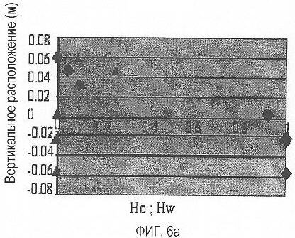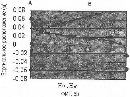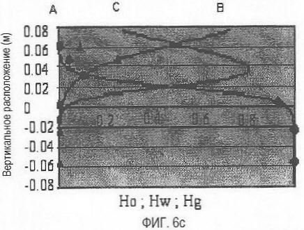 На фигуре 6а представлены величины объемных долей фаз , которые были получены шестью электрическими зондами, и величины объемных долей , которые были получены с помощью оптических датчиков. На фигуре 6b представлены интерполированные профили, которые были получены с применением способа согласно изобретению как для объемной доли воды (кривая A), так и для объемной доли газа (кривая B). Модель потока, которая была выбрана для осуществления способа согласно изобретению, является моделью, основанной на методе наименьших квадратов. На фиг. 6с дополнительно показан профиль объемной доли (кривая С), который был получен простым вычитанием двух других профилей.