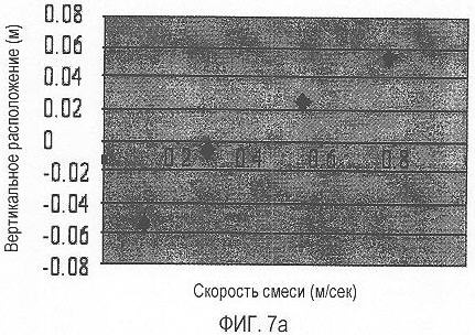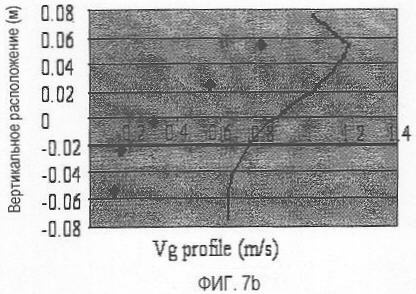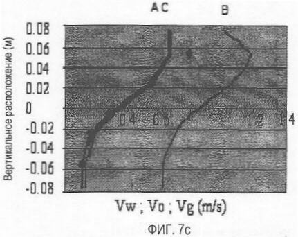 На фигуре 7а представлены измеренные локальные скорости смеси, которые были выведены из скоростей вращения пяти расходомеров (принимая в расчет калибровку этих расходомеров). На фигуре 7b показана кривая, соответствующая профилю скорости газа, которая была выведена согласно способу в соответствии с изобретением, используя интерполированный профиль объемной доли газа, и скорости проскока газ/жидкость, полученной с помощью модели проскока. На фигуре 7с дополнительно представлены профили скорости нефти и воды соответственно (кривые С и А), которые были определены согласно способу изобретения с применением профиля скорости жидкости (рассчитанного с помощью интерполированных профилей объемных долей нефти и воды), модели проскока и скорости проскока нефть/вода. Последний этап способа дает объемные скорости фаз, полученные на основании этих профилей: Qw=9,64 м3/час, Qo=9,92 м3/час, Qg=6,52 м3/час. Эти значения показывают, что способ согласно изобретению может дать весьма удовлетворительные результаты, используя данные, измеренные в трехфазном потоке.