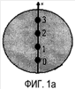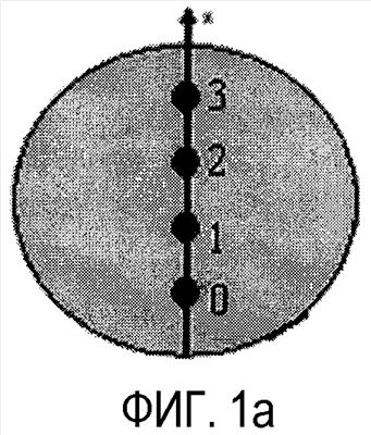 Во втором варианте осуществления изобретения этап коррекций может также содержать проверку локальных измерений, получаемых для фазовой объемной доли и/или для скорости. Действительно, набор локальных измерений (фазовые объемные доли или скорости), которые были получены средством измерения, может иметь некоторую несогласованность, которая достаточно ясно будет обнаружена перед началом любой другой обработки. Целью данной коррекции является, следовательно, осуществление контроля, чтобы все измеренные данные одного и того же типа были согласованы между собой. При обнаружении несогласованности будет осуществляться коррекция. Фигуры 1а и 1b представляют пример такой коррекции, проделанной с измерениями локальной скорости. Фигура 1а показывает вертикальное перераспределение датчиков скорости, расположенных соответственно в точках 0, 1, 2, 3 в поперечном сечении скважины, когда поток стационарный, и фигура 1b показывает коррекцию неверного набора измерений.