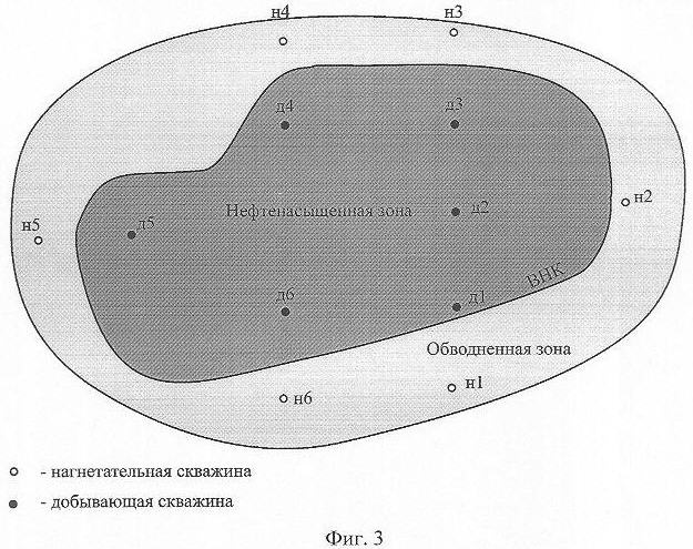Как видно из фиг.3, нефтенасыщенная зона окружена обводненной областью. Здесь объекты управления: