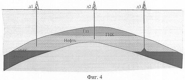 В случае расположения нефтяного пласта между газовой шапкой и водоносным слоем (фиг.4) в процессе эксплуатации забои добывающих скважин занимают различные положения относительно текущих ВНК и газонефтяного контакта (ГНК). Более того, в призабойной зоне скважины д3 имеется конус воды. Информация о состоянии объекта получена аналогично вышеизложенному. В данном случае объекты управления: