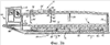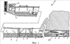Кроме того, как видно из фиг.2, 3а и 3b, выпускное транспортное средство L содержит защитный козырек 22, соединенный с главным несущим каркасом 12 с помощью расположенных через интервалы опорных стоек 24 и распорок 26. Вдоль длины выпускного средства L на определенном расстоянии друг от друга расположены две группы домкратов 28, которые опираются на полозья 30 и могут быть приведены в действие для подъема главного несущего каркаса 12 выпускного средства L с уступа В для того, чтобы с помощью тяжелого оборудования или направляющих рельсов шнекобуровой машины переместить выпускное транспортное средство к месту разработки месторождения.