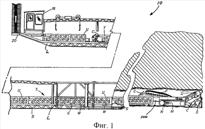 Из изображения, представленного на фиг.1, понятно, что конвейерная цепь Т содержит столько конвейерных узлов U, сколько необходимо, чтобы цепь доходила от пласта до выпускного транспортного средства L, установленного на уступе В. Видно, что уступ В предпочтительно вырубают ниже подошвы пласта для того, чтобы поместить выпускное транспортное средство или платформу L.