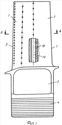 На фиг.1 показан вид сбоку на рабочую охлаждаемую лопатку турбины. На фиг.2 показано сечение А-А на фиг.1.