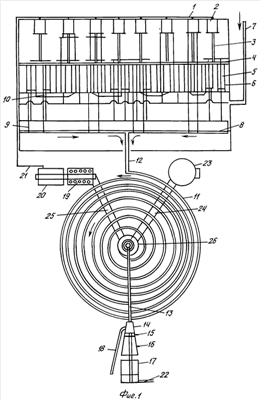 1) изотермического многоцилиндрового поршневого компрессора с червячными передачами 3, которые приводятся в действие электродвигателями 2, сжимающими воздух в цилиндрах 6 до 25 кг/см2; компрессор помещается в воду;