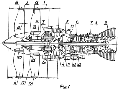 Двухконтурный газотурбинный двигатель 1 состоит из биротативного вентилятора 2, редуктора 3, компрессора низкого давления 4, разделительного корпуса 5, компрессора высокого давления 6, камеры сгорания 7, турбины высокого давления 8 и турбины низкого давления 9, которая валом 10 соединена с редуктором 3.