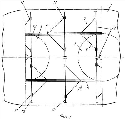 Гибкие тяги 13, соединяющие между собой вертикальные оси 8 створок 6, 7 лопастей, связаны с механизмом 14 для изменения угла их наклона. Механизм 14 может быть выполнен, например, винтовым, соединенным винтами с гибкими тягами 13, а гайками с верхним 4 и нижним 5 гибкими тяговыми элементами.