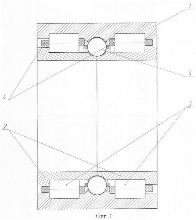 На фиг.1 изображен двухрядный роликовый подшипник, внутри которого размещен бесколечный шариковый подшипник. Между наружным кольцом 1 и внутренними кольцами 2 в сепараторах 4 размещены два ряда роликов 3, а шариковый подшипник 5 представляет собой один ряд шариков, размещенных в желобах, выполненных в выступающей части наружного кольца и на внутренних кольцах.