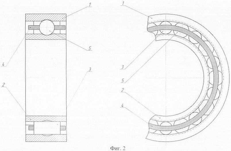 На фиг.2 представлен второй вариант конструкции роликового подшипника. Между наружным кольцом 1 и внутренним кольцом 2 в сепараторе 4 размещены ролики 3 и шарики 5. Для обеспечения работы шариков 5 в центральной части роликовых дорожек качения колец 1 и 2 выполнены тороидальные дорожки качения. Радиальный зазор в шариковом подшипнике выбирают из представленного выше выражения. Так как шарики 5 вместе с желобами представляют собой радиально-упорный подшипник, то это ограничивает осевую «игру» подшипника. Поэтому кольца 1 и 2 выполнены без бортов, что существенно упрощает конструкцию и экономит материал подшипников.