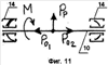На Фиг.11 представлена схема, в которой для обеспечения работоспособности механизма при нагрузке на вал 10 от крутящего момента М, осевых усилий Ро, направленных в противоположные стороны, и радиальной нагрузки Pр применены два упорных, сферических подшипника 14, при этой схеме возможна компенсация угловых деформаций вала 10.
