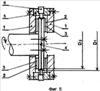 На Фиг.5 представлен подшипниковый узел – осевой двустороннего действия, где: 1 – неподвижная плата, 2 – опорный элемент, 3 – упругодеформированный лепесток, 4 – подвижная плата, 5 – замок, 6 – ключ.