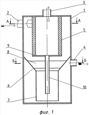 Газопаросодержащий поток конденсата подают через тангенциальный входной штуцер 2 в полость корпуса 1, где под действием инерционных, центробежных и гравитационных сил он приобретает спиралевидную форму движения, вращаясь в кольцевом пространстве между цилиндрическими поверхностями (наружной полого цилиндра 5 и внутренней корпуса 1), одновременно опускаясь сверху вниз. В результате взаимодействия центробежной и архимедовой силы для вращающейся среды жидкая фаза потока (конденсат) отжимается к внутренней поверхности корпуса 1, а газообразная фаза (пар и газ) – к наружной поверхности полого цилиндра 5. Пар и газ, “отжатые” к поверхности полого цилиндра 5, проходят через поры этого цилиндра и выводятся из внутренней полости цилиндра 5 через штуцер 3. Конденсат, отжатый к внутренней поверхности корпуса 1, опускается к воронке 6, в которой благодаря сопротивлению вертикальных пластин 8, гасит свое вращательное движение и уже без вращения опускается по патрубку 7 к донной части конденсатоотводчика. Большая часть конденсата, попавшая на наружную поверхность полого цилиндра 5 за счет гидрофобных свойств его поверхности, лишена возможности проникновения вовнутрь цилиндра через его поры, и, в виде капель, под действием гравитационных сил скатывается вниз в воронку 8, где смешивается с основным потоком конденсата. Отдельные мельчайшие капли конденсата, прошедшие через поры полого цилиндра 5, в виде мелких капель скатываются по внутренней поверхности полого цилиндра 5 к днищу 9 и через патрубок 10 сливаются в полость патрубка 7, где также смешиваются с основным потоком конденсата.
