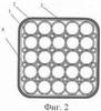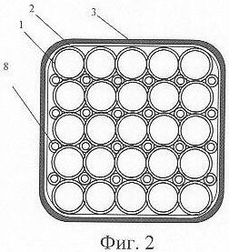 Пакет капилляров выполнен в виде монолита, собранного из капилляров двух размеров капилляров: капилляров 1 – «толстых» и капилляров 8 – «тонких». Оси «толстых» капилляров 1 образуют в поперечном сечении прямоугольную сетку, а «тонкие» капилляры 8 заполняют промежутки между плотно упакованными капиллярами 1 большего диаметра (Фиг.2). Диаметр «толстых» капилляров 1 может иметь размеры в пределах от 20 до 200 мкм, преимущественно в диапазоне 50÷80 мкм, при этом диаметр «тонких» капилляров 8 соотносится с диаметром «толстых» капилляров как 1:2,5. При такой упаковке капилляров 1 и 8 в пакете показатель относительной плотности их компоновки по объему пакета достигает максимальной величины 0,87 и превосходит плотность компоновки равновеликих микросфер в 3-мерной упаковке, которая не превышает величины 0,75. Используемый для изготовления капилляров 1 и 8 материал должен быть легким и прочным (предел прочности желательно в диапазоне 4÷5 тыс. МПа) при уровне энергии активации водородной проницаемости при нагреве не менее 55÷60 кДж/моль.
