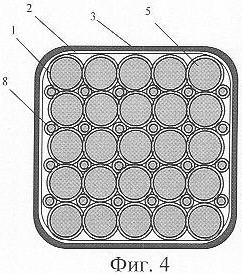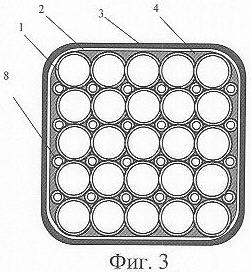 На фиг.4 схематично показано устройство аккумулятора водорода с торца, снабженного рукояткой, где 1 – капилляр; 2 – стеклянная оболочка; 3 – кожух аккумулятора водорода; 5 – торцы “толстых” капилляров, закрытые герметизирующими заглушками 5; 8 – торцы “тонких” капилляров, закрытые герметизирующими заглушками 5.