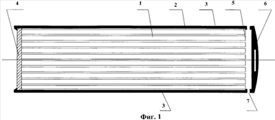 На фиг.1 схематично представлена структура аккумулятора водорода в продольном разрезе, где 1 – капилляр; 2 – стеклянная оболочка; 3 – кожух картриджа; 4 – пластина диффузора из стекла; 5 – герметизирующая заглушка; 6 – рукоятка картриджа; 7 – отверстия для пропуска водорода.