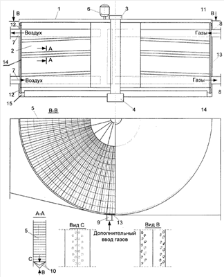 Представленный на чертеже РВВ в соответствии с данным изобретением содержит кожух 1, внутри которого находится барабан 2, вал которого закреплен в опорно-упорном 4 и упорном подшипниках 3, барабан разделен на сектора, внутренний объем секторов заполнен насыпной набивкой 5, для вращения барабана на кожухе установлен привод 6, а на барабане зубчатое колесо 11. Для подвода и отвода уходящих газов и воздуха и создания противоточного движения теплообменивающихся сред на цилиндрической поверхности кожуха установлены патрубки 7 и 8. Между патрубками подвода и отвода уходящих газов и воздуха по всей высоте цилиндрической поверхности кожуха размещены два патрубка дополнительного ввода газов 9. Для уменьшения перетекания воздуха на сторону газов вверху и внизу барабана и кожуха установлены периферийные уплотнения 12, на внутренней цилиндрической поверхности кожуха по периферии патрубков для дополнительного ввода газов также установлены периферийные уплотнения 13. Участки, на которые по высоте разбита набивка в секторах, начинаются и заканчиваются коробами 10, короба скомпонованы в пары таким образом, что образуют полость и направлены выпуклой поверхностью вниз, при этом в центральной области верхнего короба и периферийной области нижнего короба выполнены отверстия. Влага, выделяющаяся из газов в набивке барабана, улавливается в полостях коробов, отводится по нижнему коробу к периферии барабана, сливается вниз по сливному стояку 14 и отводится в канал 15. Для защиты от замерзания воды, расположенной в канале 15, в полость, образованную нижними торцевыми поверхностями кожуха и барабана, выполнен дополнительный ввод газов с давлением, равным давлению воздуха, подаваемого в РВВ.