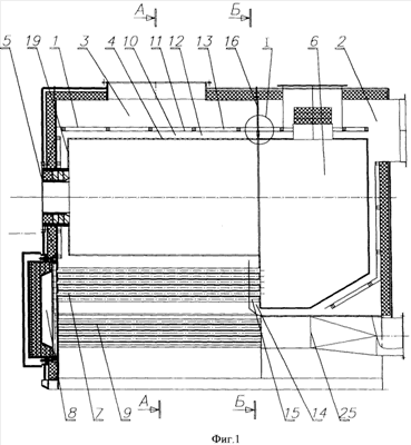 Воздух, который проходит через внутреннюю часть воздушного канала 12, получает на нагрев 2/3 от количества тепла, поступающего через стенку жаровой трубы 4 или стенку воздушного канала 13. Это обеспечивается благодаря тому, что внутренняя часть воздушного канала 12 имеет, по крайней мере, в 1,5 раза большее сечение, чем внешняя часть воздушного канала 13.
