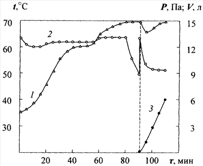 Испытания способа проведены с помощью устройства для выпаривания в вакууме [2]. Устройство включает испаритель объемом 40 л, конденсатор, сборник конденсата объемом 10 л и насос. При испытаниях в качестве резервуара с более высоким разрежением использован сборник конденсата, для чего в устройство был введен дополнительный вентиль, установленный между конденсатором и сборником конденсата. Вентиль позволяет, отключив испаритель от насоса, создавать более высокое разрежение в сборнике конденсата, а затем в результате его подключения формировать в испарителе импульс дополнительного разрежения. Испытания проведены на спиртосодержащей жидкости крепостью 18 градусов. В камеру испарителя загружено 20 л жидкости. После включения насоса в системе установилось разрежение 12 Па. Временные зависимости температуры в камере испарителя (кривая 7), остаточного давления в системе (кривая 2) и объема дистиллята (кривая 3) приведены на чертеже. Регулированием мощности нагрева температура в камере испарителя была доведена до величины 60°С, близкой к температуре кипения. Однако выдержка в течение 20 мин при данных условиях не привела к кипению. В результате дополнительного кратковременного нагрева температура в испарителе увеличилась до 70°С. Рост температуры снизил разрежение до 13 Па и не инициировал кипение. На 80 мин был перекрыт вентиль, установленный между конденсатором и сборником конденсата. После отсечки испарителя пары выпариваемой жидкости перестали поступать в насос и в течение 10 мин разрежение в сборнике конденсата выросло на 34% до 8,6 Па. Открытие вентиля на 90 мин обеспечило подачу импульса дополнительного разрежения в камеру испарителя. Результатом воздействия импульса разрежения явилось взрывное вскипание жидкости. Одновременно с возникновением объемного кипения конденсат начал поступать в сборник конденсата и стала снижаться температура в испарителе. Включение нагрева в момент начала конденсации позволило обеспечить скорость выпаривания 95%·час-1. Разрежение в системе увеличилось на 29% до 9,3 Па.