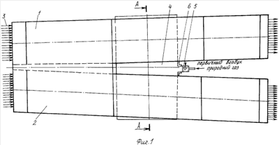 Сушильная установка содержит два наклонных автономных теплоизолированных короба, соответственно поз.1-2 на фиг.1, которые установлены под острым углом друг к другу с минимальным зазором на начальном участке. В коробах протягивают и сушат проволоку 3. Под коробами, в центре, по ширине и длине установлена отопительная газовая камера 4. Из фиг.1 видно, что в месте установки по ширине отопительная камера 4 немного выступает за пределы коробов 1-2. С правой стороны отопительной камеры 4 по ее ширине установлена газовая горелка 5, например, типа ГНП конструкции института «Теплопроект» с установочной плитой 6. Из поперечного разреза установки, представленного на разрезе А-А фиг.2, видно, что для розжига горелки 5 непосредственно над ней в отопительной камере 4 установлена запальная трубка 7, а протяжные короба 1-2 соединены с отопительной камерой двумя теплоизолированными дымовыми трубами соответственно 8-9. Теплоизоляция труб выполнена из каолиновой ваты. В дымовые трубы подведены сопла вторичного воздуха соответственно 10-11. Крышки 12 коробов футерованы шамотоволокнистыми плитами ШВП, а боковые стенки 13 – шамотом-легковесом ШЛ-0,4. Газовая камера футерована шамотом-легковесом ШЛ-1,0. Футеровка указанных элементов установки выполнена внутри стальных корпусов, внутренняя поверхность которых покрыта асбестовым листом. На разрезе Б-Б фиг.3 показан продольный косой разрез установки по оси одного из коробов в месте соединения с дымовой трубой и отопительной камерой. Из него видно, что короба содержат входные и выходные окна соответственно 14-15, горелка снабжена горелочным камнем 16, а сушильная установка – опорными стойками 17. Здесь следует отметить, что дополнительной опорой для коробов является отопительная газовая камера, которая практически перекрывает всю установку по ширине.