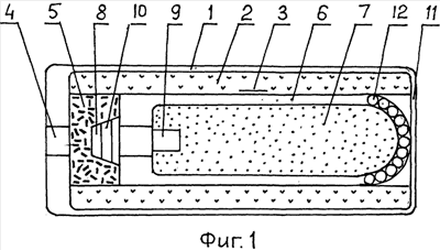 Телескопический патрон, представленный на фиг.1 содержит цилиндрическую гильзу 1 с расположенным в ней монолитным пороховым зарядом 2, имеющим осевой канал, в котором помещен снаряд 3. В дне гильзы помещен воспламенитель 4, а в донной части ее полости – вышибной заряд 5. Снаряд содержит корпус 6 с размещенным в нем зарядом взрывчатого вещества 7 и донным траекторно-ударным взрывателем 8 с детонатором 9. Взрыватель содержит электронное устройство траекторного подрыва (или временное, или числооборотное, или неконтактное, или командное) и устройство ударного подрыва инерционного типа. Взрыватель снабжен бесконтактным приемником команд 10. Переднее дно гильзы 11 выполнено заодно с корпусом. Головная часть снаряда упирается в переднее дно.