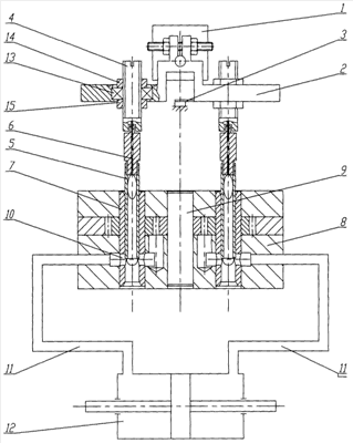 РМ функционирует следующим образом. При подаче управляющего тока на обмотку реле 1 его выходной вал поворачивается на определенный угол, качалка 2, жестко закрепленная на валу реле 1, поворачивается на тот же угол. Позиционная нагрузка на валу реле в зависимости от управляющего тока создается плоской пружиной 3. Стержни 4, установленные на качалке 2, вместе с ней отклоняются от вертикали, а золотники 5 сохраняют вертикальное положение за счет изгиба проволочной тяги 6. При этом один золотник движется вверх, а другой – вниз внутри полых осей 7 ведомых шестерен трехшестеренного насоса 8, приводимого в движение ведущей шестерней 9, причем золотники 5 определенным образом перекрывают радиальные отверстия 10, связанные гидравлическими магистралями 11 с силовым механизмом 12. Стержень 4 установлен в отверстии подшипника 13, зафиксированного на качалке 2. За счет перемещения стержня 4 относительно качалки 2 обеспечивается регулирование перекрытия радиальных отверстий 10 золотником 5, т.е. обеспечивается регулировка скорости перемещения штока силового механизма 12. Контргайки 14 и 15 фиксируют положение стержня 4 относительно внутренней обоймы подшипника 13 и соответственно качалки 2 после регулировки скорости, но позволяют ему вращаться вокруг своей оси.