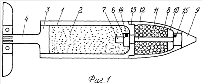 Снаряд по схеме фиг.1 содержит корпус 1, размещенный в корпусе заряд ВВ 2, ввинтное дно 3 с присоединенным к нему стабилизатором 4, головную часть 5, пиротехническое устройство отделения головной части 6, размещенное в одном блоке с детонатором 7. Головная часть включает в себя головной колпак 8, расположенные в нем контактно-траекторный взрыватель 9, пороховой вышибной заряд 10, осколочный блок 11. Взрыватель соединен трубкой 12 с устройством отделения 6. Головная часть соединена резьбой 13 с корпусом. Устройство 6 и заряд 10 снабжены замедлителями 14 и 15.