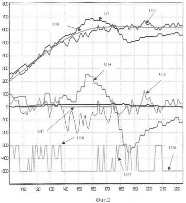 В средней (по высоте) части графика представлены усиленные сигналы: первого рассогласования – U14, второго рассогласования – U15 и выхода формирователя 8-U81,