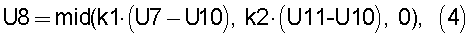 где mid – оператор выбора второго по величине сигнала, коэффициенты k1, k2 определяют постоянные времени фильтрации при прохождении на выход блока 8 первого либо второго рассогласования.