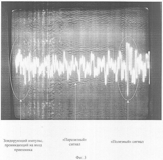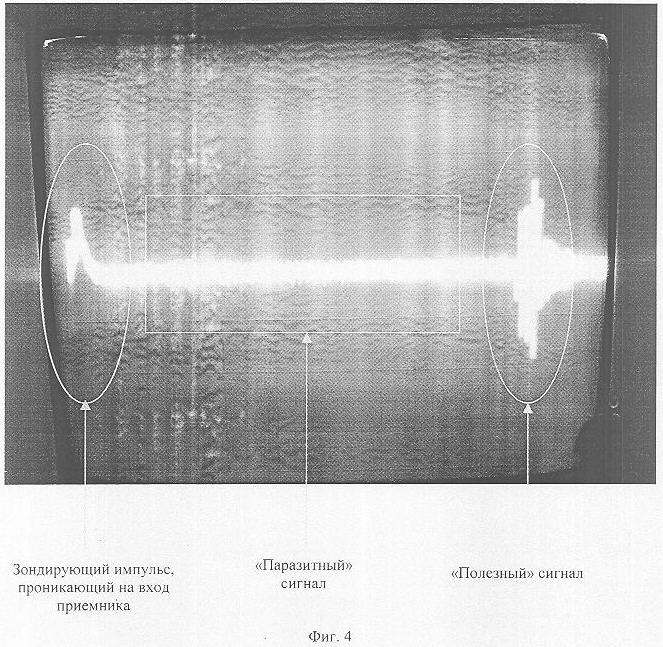 Кроме того, «паразитный» сигнал в заявляемом устройстве подавляется в большей степени, чем в известных устройствах за счет указанных выше факторов, что иллюстрируется осциллограммами сигнала на выходе ультразвукового преобразователя-прототипа – фиг.3 и сигнала на выходе заявляемого ультразвукового преобразователя – фиг.4.