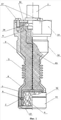 Сборку датчика выполняют в следующей последовательности. Монтажное приспособление 2 без крышки 16 и корпус 4 соединяют звукоизолятором 3. Крепление звукоизолятора 3 к корпусу 4 и монтажному приспособлению 2 выполняют любым известным способом, например, пайкой. Коаксиальный разъем 1 устанавливают на крышку 16 монтажного приспособления 2 и укрепляют на ней с помощью гайки 18. К верхней и нижней обкладкам пъезоэлемента 8 припаивают провода 9, пропускают их сквозь внутренние полости корпуса 4, звукоизолятора 3 и монтажного приспособления 2 и соединяют с контактами коаксиального разъема 1. Затем с помощью резинового кольца 7 закрепляют пъезоэлемент 8 внутри корпуса 4. При этом кольцо 7, с одной стороны, охватывает пьезоэлемент 8 в его серединной части, а с другой – устанавливается в канавку 6, выполненную на внутренней поверхности корпуса 4. Форма кольца 7 выбрана таким образом (фиг.2), что между внутренней поверхностью кольца 7 и боковой поверхностью пьезоэлемента 8 образуются зазоры, через которые компаунд 13 может заполнить ту часть корпуса 4, которая лежит ниже горизонтальной плоскости симметрии пьезоэлемента 8. Навинчивают последовательно на корпус 4 контргайку 10, а затем гайку 11, таким образом, чтобы величина расстояния между внутренней поверхностью мембраны 12 и торцом пьезоэлемента 8 было бы близка к значению , где – длина акустической волны в материале компаунда 13. Заполняют компаундом 13 холодного отверждения внутренние полости ультразвукового преобразователя через торец монтажного приспособления 2. Присоединяют с помощью винтов 17 крышку 16 с коаксиальным разъемом 1 к монтажному приспособлению 2.