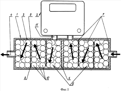 Предложенный компенсатор 1 гидравлического удара со счетчиком 2 топлива в топливных системах двигателей выполнен в виде единой емкости, образующей корпус 3 компенсатора и выполненной диаметром, гораздо превышающим диаметр трубок топливной магистрали (не показаны), с присоединенными к его торцам штуцерами 4 подвода/отвода топлива. Корпус 3 может быть выполнен и нецилиндрическим, однако цилиндрическая его форма наиболее технологична в изготовлении. Корпус 3 имеет в середине внутреннюю глухую перегородку 5, которая разделяет его по длине на две многопроходные компенсационные камеры 6, соединяющиеся между собой только через счетчик 2 топлива. Внутренний объем каждой компенсационной камеры 6 разделен диаметрально на несколько полостей 7 дисками 8, в каждом из которых выполнено отверстие 9 для перетекания рабочей среды из одной полости в другую. Размер отверстия 9 в диске 8 равен размеру штуцеров 4 подвода/отвода топлива в корпус 3 компенсатора 1. Такое соотношение размеров отверстий 9 и размеров штуцеров 4 является оптимальным. Именно в этом случае появляется возможность компенсировать гидравлический удар полностью. Если отверстия 9 в дисках 8 будут большими, чем диаметр штуцеров 4, то часть волны повышенного давления, не встретив серьезного препятствия, будет частично «проскакивать» в счетчик 2. А если отверстия 9 в дисках 8 будут меньше, чем диаметр штуцеров 4, то в полостях 7 будет возникать повышенное давление рабочей среды, которое, попадая в счетчик 2, будет дестабилизировать его работу. В каждом диске 8 отверстие 9 выполнено на его периферии в форме сегмента, как наиболее технологичное в изготовлении (обрезается край диска). Смежные диски 8 установлены таким образом, что их отверстия 9 оказываются на диаметрально противоположных сторонах корпуса 3 компенсатора 1 для изменения направления движения рабочей среды в компенсационной камере 6. Периферийное выполнение отверстий 9 в дисках 8, а также их расположение на смежных дисках 8 на диаметрально противоположных сторонах, обеспечивает последовательное прохождение рабочей средой всех полостей компенсационных камер 6 с изменением направления движения потока рабочей среды в каждой полости 7. Количество полостей 7 в каждой компенсационной камере 6 может быть разным, но, как показала практика, для полного гашения гидравлического удара достаточно установить всего лишь по два диска 8 в каждой компенсационной камере 6, полости 7 компенсационных камер 6 полностью заполнены демпфирующими элементами 10, выполненными в виде вкладышей выпуклой формы из упругого маслобензостойкого материала, например, в виде резиновых шариков. Изменение направления движения рабочей среды, о котором говорилось выше, вынуждает последнюю, омывая, взаимодействовать со всеми демпфирующими элементами 10. Демпфирующие элементы 10 могут иметь различную жесткость и размеры, в зависимости от диапазона частот волн давления, которые гасятся, и степени снижения их амплитуды. Выполнение демпфирующих элементов 10 в виде упругих шариков предельно упрощает их конструкцию и технологию изготовления. Выпуклая форма демпфирующих элементов 10 предотвращает их прилегание друг к другу плоскостями (или слипание между собой), следовательно, позволяет сохранять постоянным общий уровень «гасящих» свойств каждой полости 7 компенса