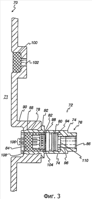 Фиг.3 – вид в разрезе образца взрывобезопасного узла 70, имеющего внутреннюю камеру 71 и образец узла датчика 72 манометрического давления, прикрепленного к ней. Образец узла датчика 72 манометрического давления содержит корпус 74, имеющий входной участок 76 и соединительный участок 78, чувствительный элемент 80 манометрического давления, узел печатной схемы 82 и пламегаситель 84.