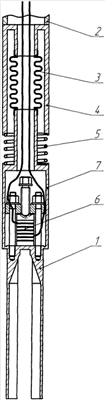 Работа виброзонда с демпфирующим устройством осуществляется следующим образом. При подаче напряжения на привод вилка начинает вибрировать с резонансной частотой, которая зависит от физических свойств контролируемой жидкости. Колебания вилки 1 приводят к сжатию-растяжению сильфона 3 и пружины 5 с частотой колебания стержней. За счет сжатия-растяжения сильфона 3 и пружины 5 не происходит передача колебаний вилки 1 на трубу 2. Таким образом, труба 2 не участвует в создании резонансной частоты и выражение (4) в этом случае имеет вид