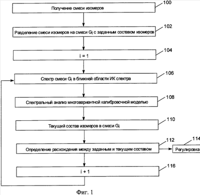 На стадии 108 проводится спектральный анализ записанного спектра в ближней области ИК-спектра с помощью хемометрической калибровочной модели. Исходя из этого на стадии 110 получают данные по текущему составу изомеров смеси Gi. На стадии 112 определяют разницу между заданным и текущим составом смеси изомеров Gi. На стадии 114 на основании установленного расхождения проводят корректирующую регулировку работающей с изомерами установки. На стадии 116 определяют вклад в индекс i и снимают следующий спектр на стадии 106. Эту операцию повторяют до тех пор, пока будет определен по одному разу текущий состав для всех смесей Gi. Затем возвращаются к индексу i, и в результате этого в течение сравнительно коротких временных интервалов, например в несколько минут, непрерывно определяют текущие составы изомеров для всех смесей Gi, и тогда в короткие сроки может быть проведена соответствующая корректирующая регулировка.