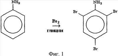 1. Химическая модификация анилина – обработка водного образца бромом в присутствии глицина. При бромировании атомы брома замещают атомы водорода в ароматическом ядре анилина в положениях 2, 4 и 6. На фиг.1 приведена схема образования 2,4,6-триброманилина при взаимодействии анилина с молекулярным бромом в присутствии глицина. При комнатной температуре (20±5°C) реакция бромирования анилина завершается в течение 40-60 сек с количественным образованием 2,4,6-триброманилина.