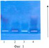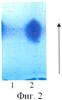 Активная форма хламидийной инфекции разрушает на только комплексы протеогликанов и гиалуроновой кислоты, но и сами эти вещества (фиг.2). В СЖ больных гиалуроновой кислоты остается мало, молекулярные размеры ее малы, поэтому она уходит далеко от старта (полоса 1). Протеогликаны также теряют способность к образованию агрегатов и уходят далеко от старта отдельным пятном (полоса 2). Стрелкой показано направление движения тока.