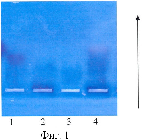 В норме в СЖ протеогликаны и гиалуроновая кислота существуют в виде комплексов, которые показаны на фиг.1 (стрелка указывает направление движения тока). В этих комплексах гиалуроновая кислота выявляется на старте нанесения образцов (полосы 2, 4). Протеогликаны представлены в виде агрегатов, поэтому движутся от старта непрерывной полосой (полосы 1, 3).