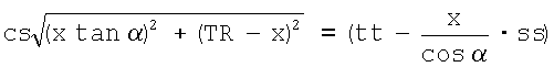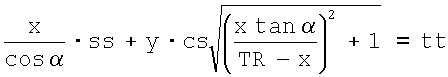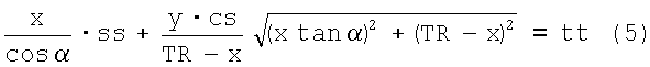 Согласно фиг.2 геометрия акустического устройства (200) дополнительно отмечена размером, задающим линейное расстояние (TR) между передатчиком (T) и приемником (Rn-1). Это расстояние (TR) подразделяется на первое линейное расстояние (х) между приемником (Rn-1) и перпендикуляром (222) длиной (h) к точке (P) преобразования/отражения, и второе линейное расстояние (y) между перпендикуляром (222) и передатчиком (T). При геометрии, показанной на фиг.2, расстояние (TR) между приемником (Rn-1) и передатчиком (T) может быть выражено как: