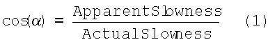 Вновь обратимся к фиг.1, где при перемещении волнового фронта (116) вдоль волновой траектории (110) он пересекает приемники (R1-Rn) и будет ими обнаружен. Однако волновой фронт (116) пересекает приемники (R1-Rn) в различные моменты времени. Предположим, что волновой фронт (116) проходит по прямолинейной волновой траектории (110), когда он пересекает все приемники (R1-Rn). Предположим также, что разница во времени распространения между двумя приемниками (в данном примере R3 и Rn-1) вызвана протяженностью траектории распространения. Протяженность траектории распространения равна произведению расстояния между двумя приемниками (R3 и Rn-1) на косинус угла ( ) падения на приемники. Угол падения ( ) определяется линией (114), проходящей между двумя приемниками (R3-Rn-1), и отрезком (118) волновой траектории (110), проходящей от второго приемника Rn-1 перпендикулярно волновому фронту (116). Угол падения ( ) можно вычислить, используя простые тригонометрические соотношения, на основе измерений действительной величины, обратной скорости волны, и измерений кажущейся величины, обратной скорости волны, выполненными приемниками (R3-Rn-1) согласно следующему уравнению: