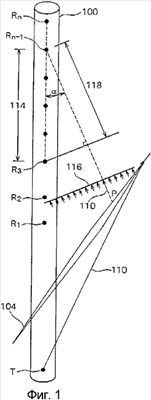 Обратимся теперь к чертежам и, в частности, к фиг.1, где показан упрощенный вид акустического устройства (100). Акустическое устройство (100) является типовым для множества устройств, поставляемых различными изготовителями, в том числе компанией Schlumberger. Акустическое устройство (100) включает в себя по меньшей мере один акустический передатчик (T), выполненный с возможностью формирования акустических волн, которые передаются через соседние породы. В некоторых вариантах осуществления изобретения имеется по меньшей мере один монопольный акустический передатчик. Акустическое устройство (100) также включает в себя два или более приемников (R1-Rn), как показано на этой фигуре. Согласно иллюстрации на фиг.1 акустическое устройство (100) включает в себя восемь приемников (R1-Rn), при этом оно и исследует некоторый признак породы, которым в настоящем изобретении является трещина (104). Волны, формируемые акустическим передатчиком (T), следуют по волновым траекториям, например, по первой волновой траектории (110), проходя от передатчика (T) к трещине (104), а затем от трещины (104) к приемнику (R1-Rn). Волновой фронт (116), распространяющийся вдоль волновой траектории (110), показан после того, как волна пересекла трещину (104). Понятно, что волновая траектория (110) и волновой фронт (116) являются по сути примерами и используются в целях облегчения понимания принципов изобретения. Вдобавок к волнам, представленным как распространяющиеся вдоль волновой траектории (110), при действительной реализации изобретения также будет иметь место множество других волн. Волновая траектория (110) представляет аппроксимации траекторий распространения волн, когда волны распространяются от передатчика (T) через трещину (104) к приемникам (R1-Rn). Процессор, например компьютер, может быть встроенным в акустическое устройство (100) или иметь дистанционную связь с акустическим устройством (100) для управления, приведения в действие, сбора данных, вычислений или других целей.